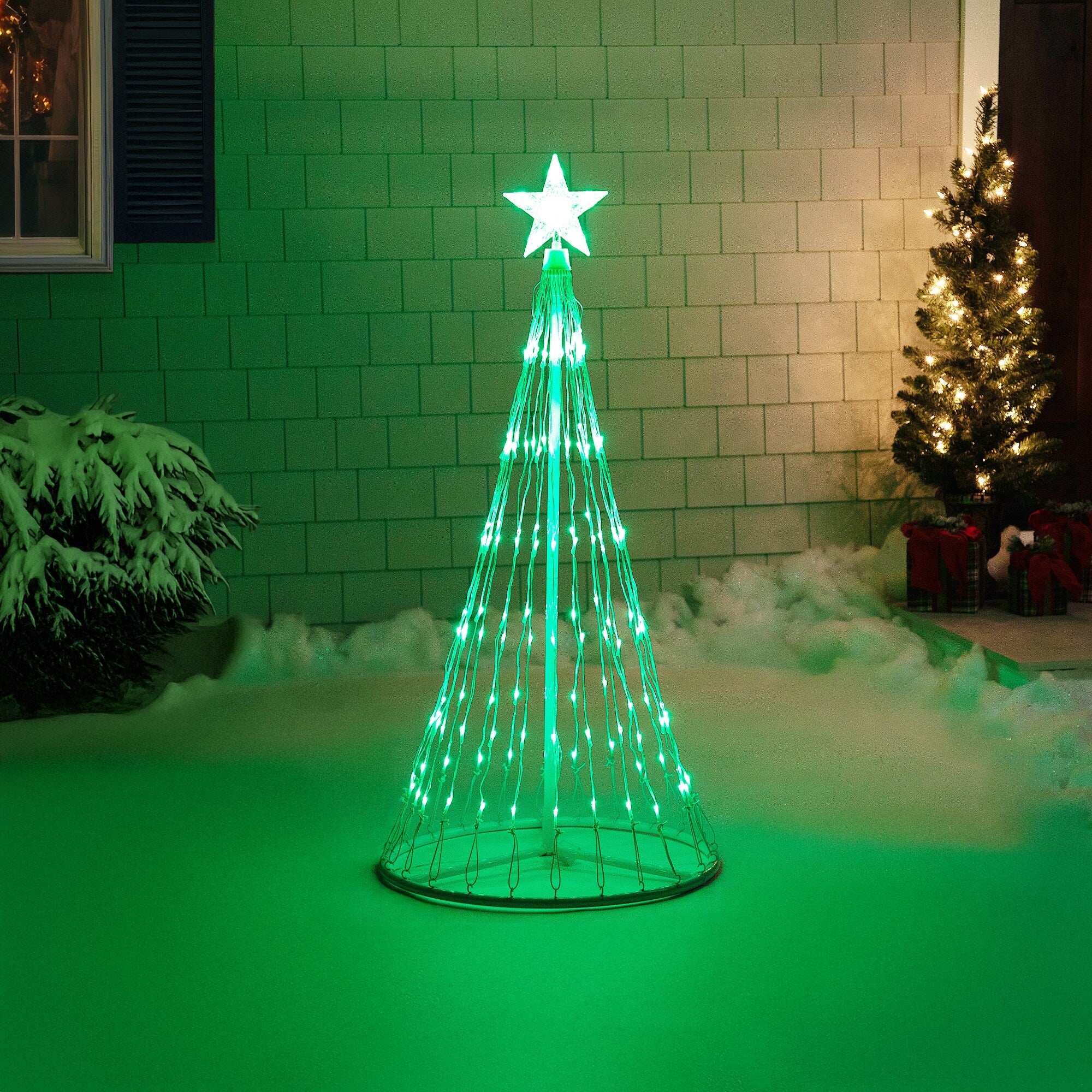 It’s a Christmas light show all on its own! More than 150 green LED lights offer twelve dazzling effects on this 4’ Christmas light show cone tree that blends decorating traditions with modern function. A control box lets you choose steady, twinkle, slow fade, fast spiral and four more light show effects, making this outdoor Christmas cone tree an unforgettable addition to your holiday lawn decorations. Let our green cone Christmas tree add a special sparkle to your holidays and your outdoor light display.
