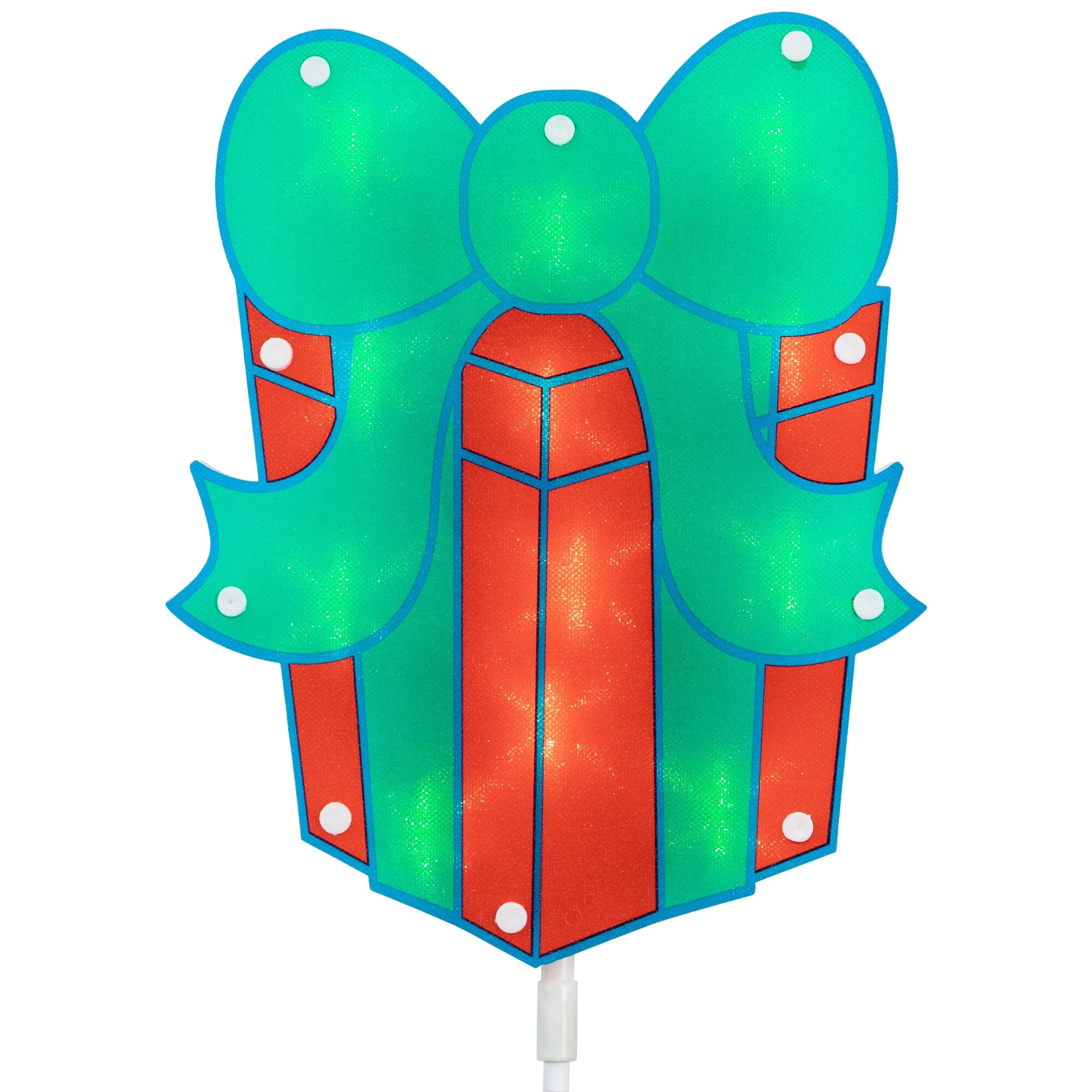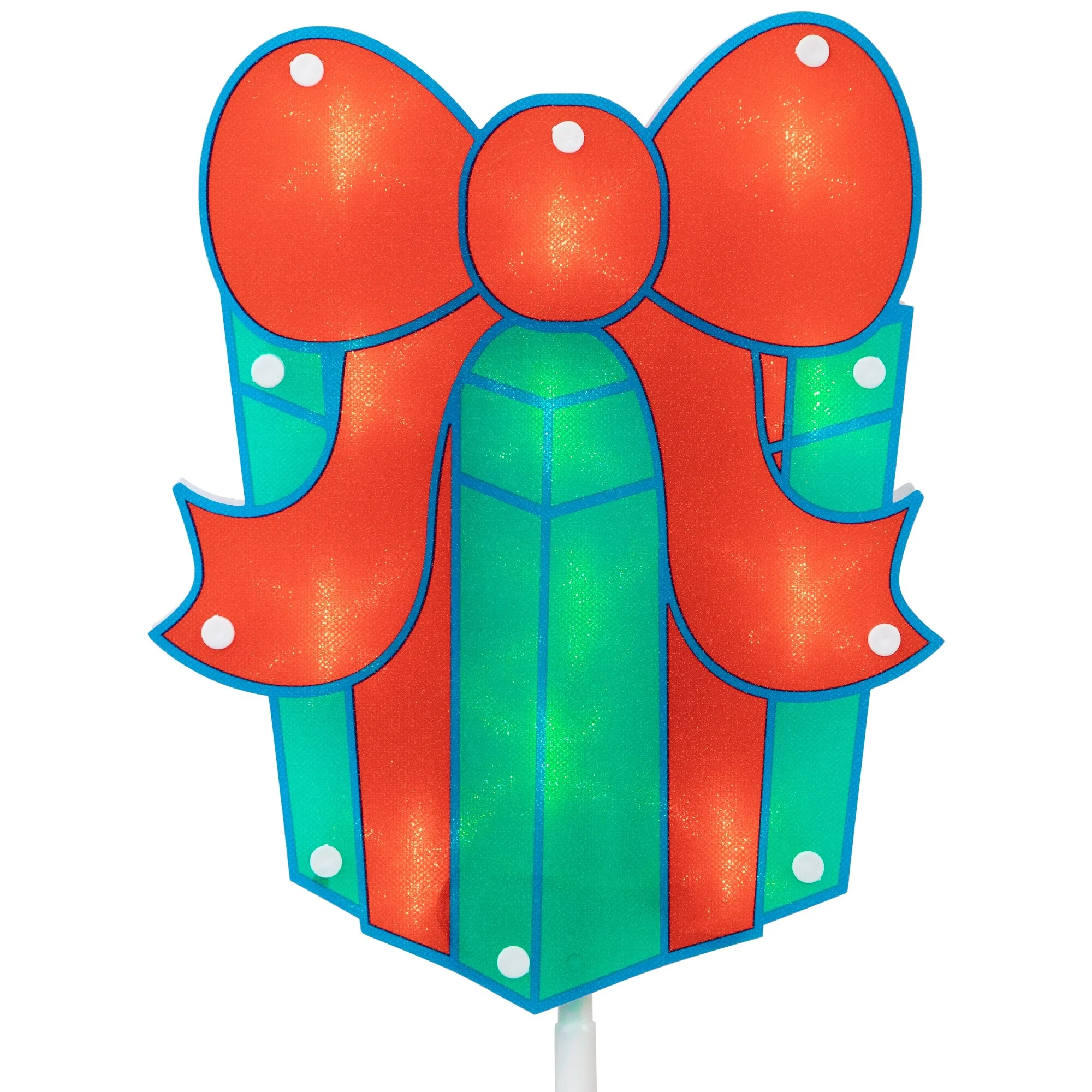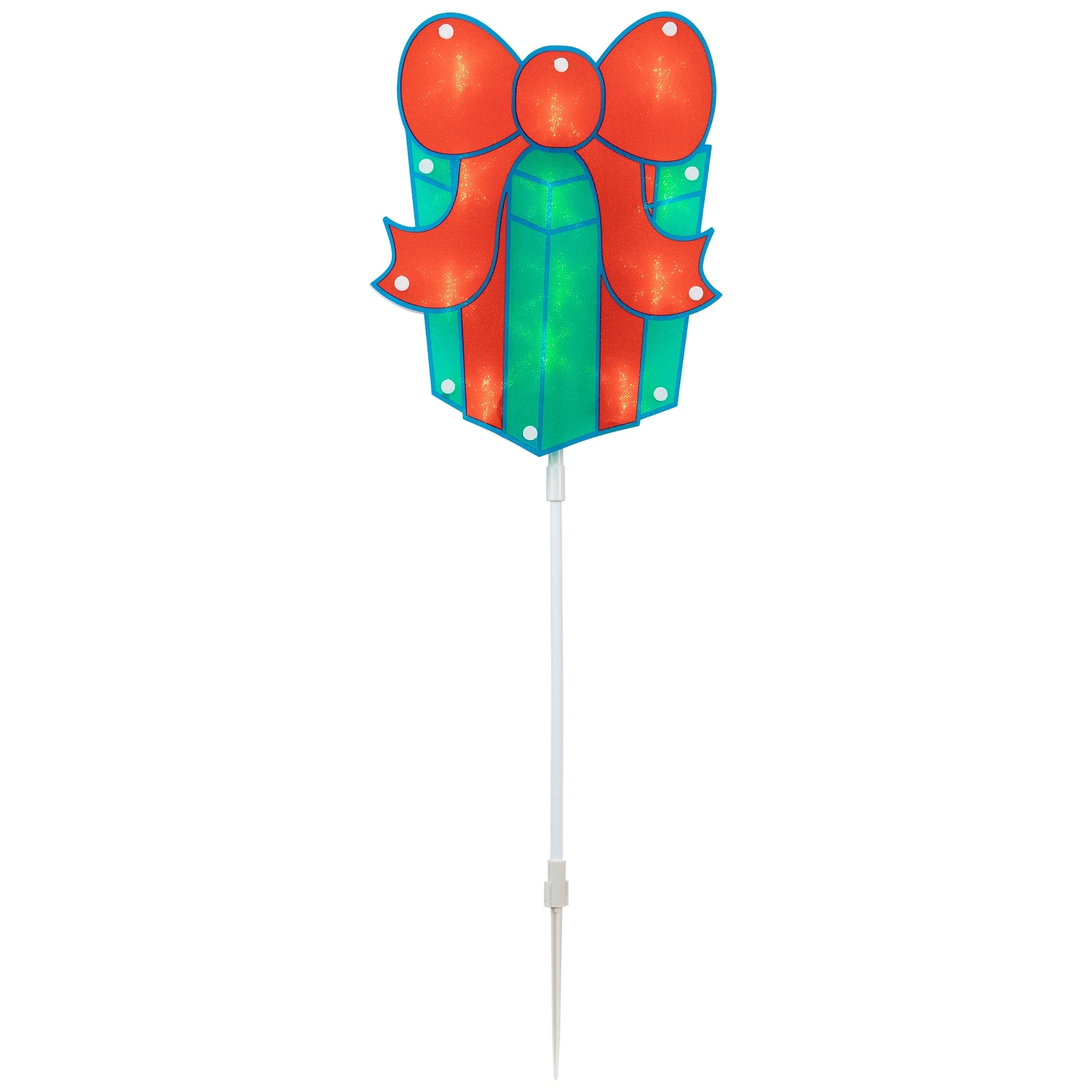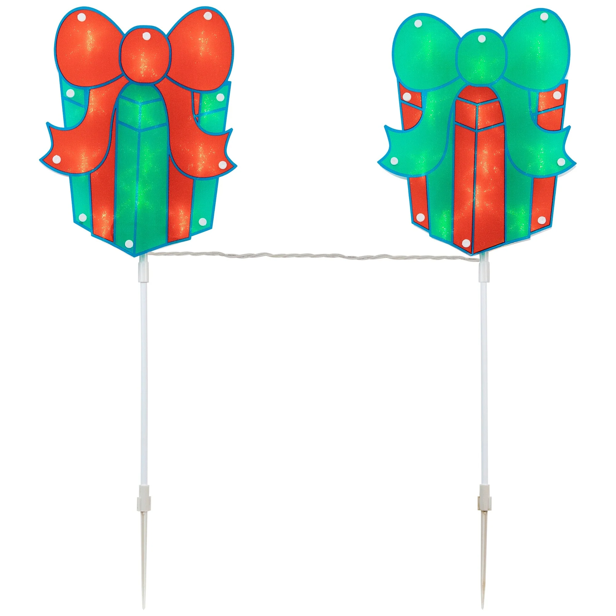 Create a festive holiday ambiance with these lighted holographic gift boxes for holiday pathway decor! This 3-count set features clear-lit, holographic gift boxes, each adorned with 12 mini incandescent bulbs—36 lights in total. With 15 inches of spacing between each marker, these charming Christmas pathway markers with clear lights are perfect for lining pathways, driveways, or flowerbeds. Designed for outdoor use, the set includes sturdy lawn stakes. UL-certified for safety and reliability, these pathway markers add a magical holiday touch to your outdoor space.