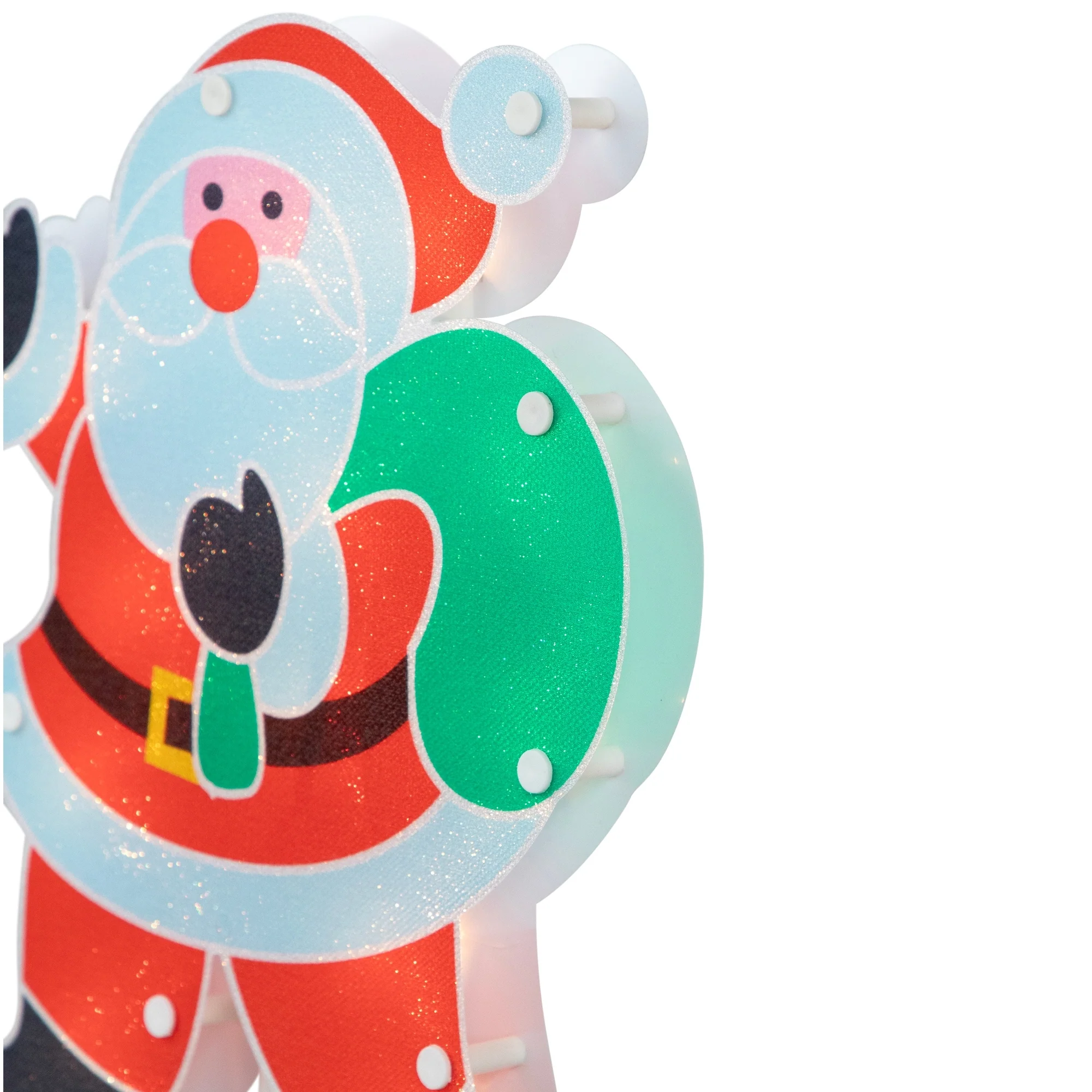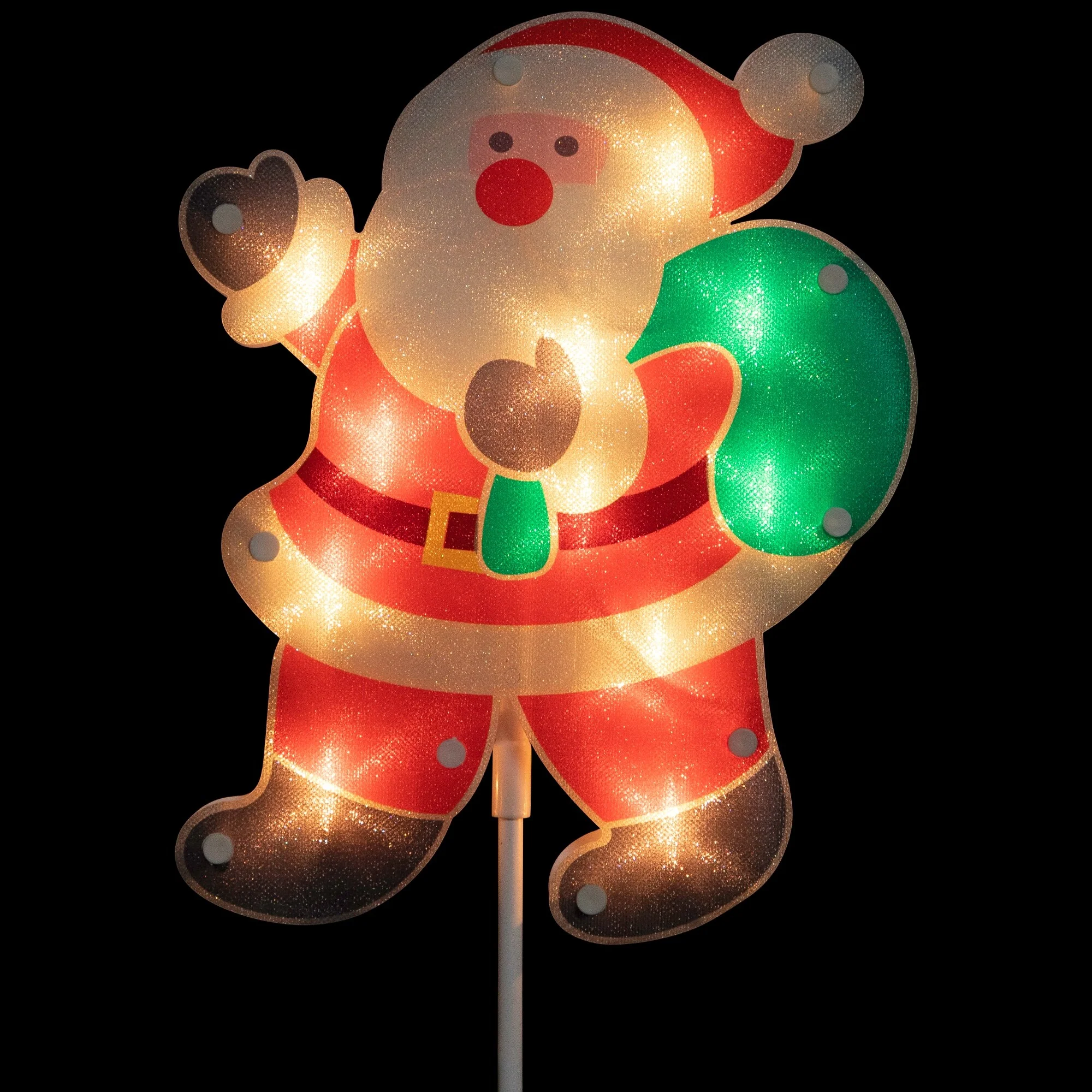 Brighten up your holiday walkway with this set of 3 holographic Santa Claus pathway markers. Each Santa is pre-lit with 12 bright clear incandescent mini-lights, totaling 36 lights across the set. Perfect for lining walkways, driveways, and flowerbeds, each Santa is attached to a lawn stake for easy setup and features 12" spacing between markers. UL certified for outdoor use, these markers have a convenient plug with end connector for stacking multiple sets. If one bulb goes out, the rest stay lit, ensuring a festive glow all season long!