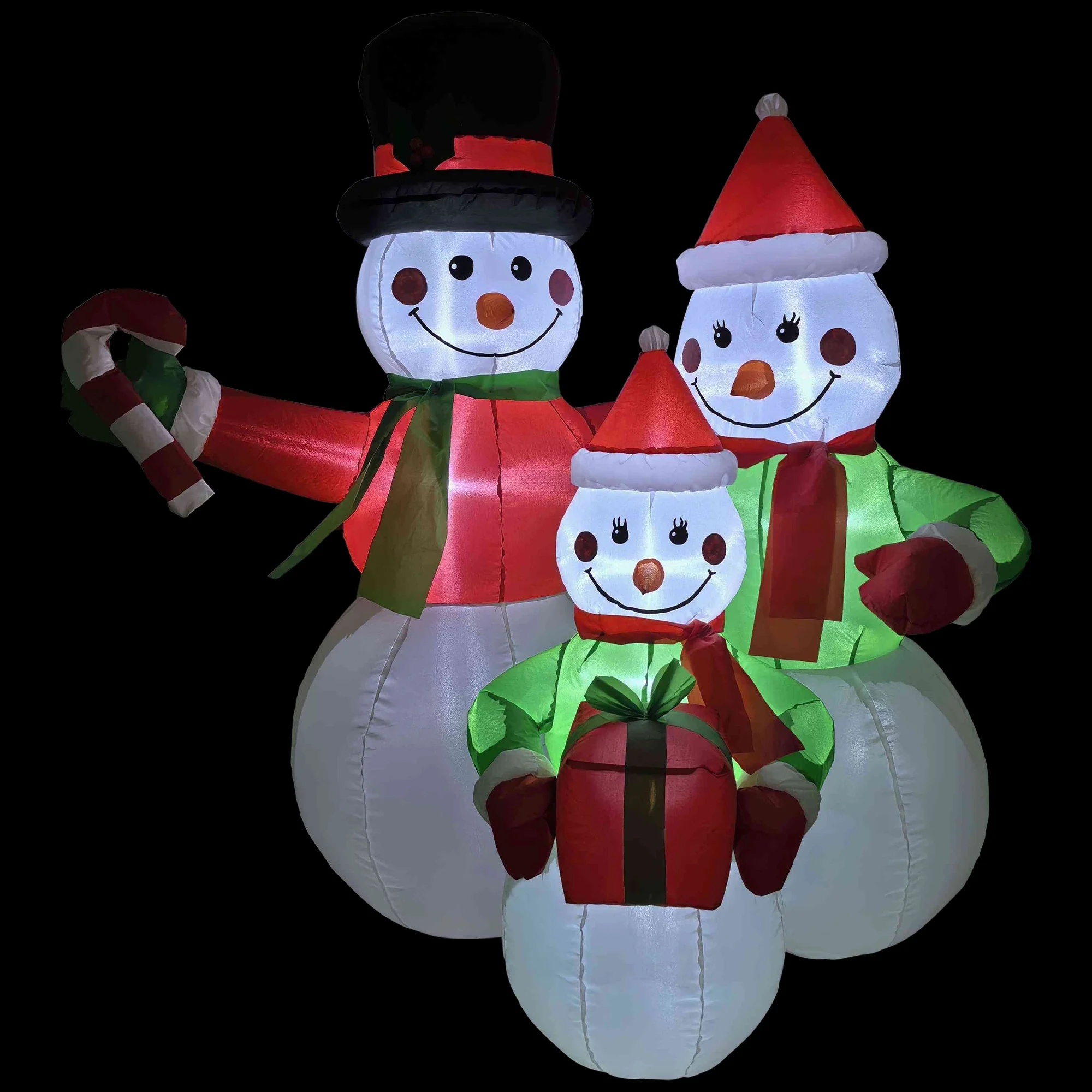 Bring the holiday spirit to your outdoor décor with our charming inflatable snowman family. Standing tall in your yard, this delightful decoration features a proud dad in a festive red sweater and a classic black top hat, while mom and child sport matching green sweaters and cheerful Santa hats. Accented with cozy scarves, mittens, a candy cane, and a present, this merry scene is sure to spread joy and warmth to all who pass by. Make your home the beacon of festive cheer with this adorable addition to your Christmas display.
