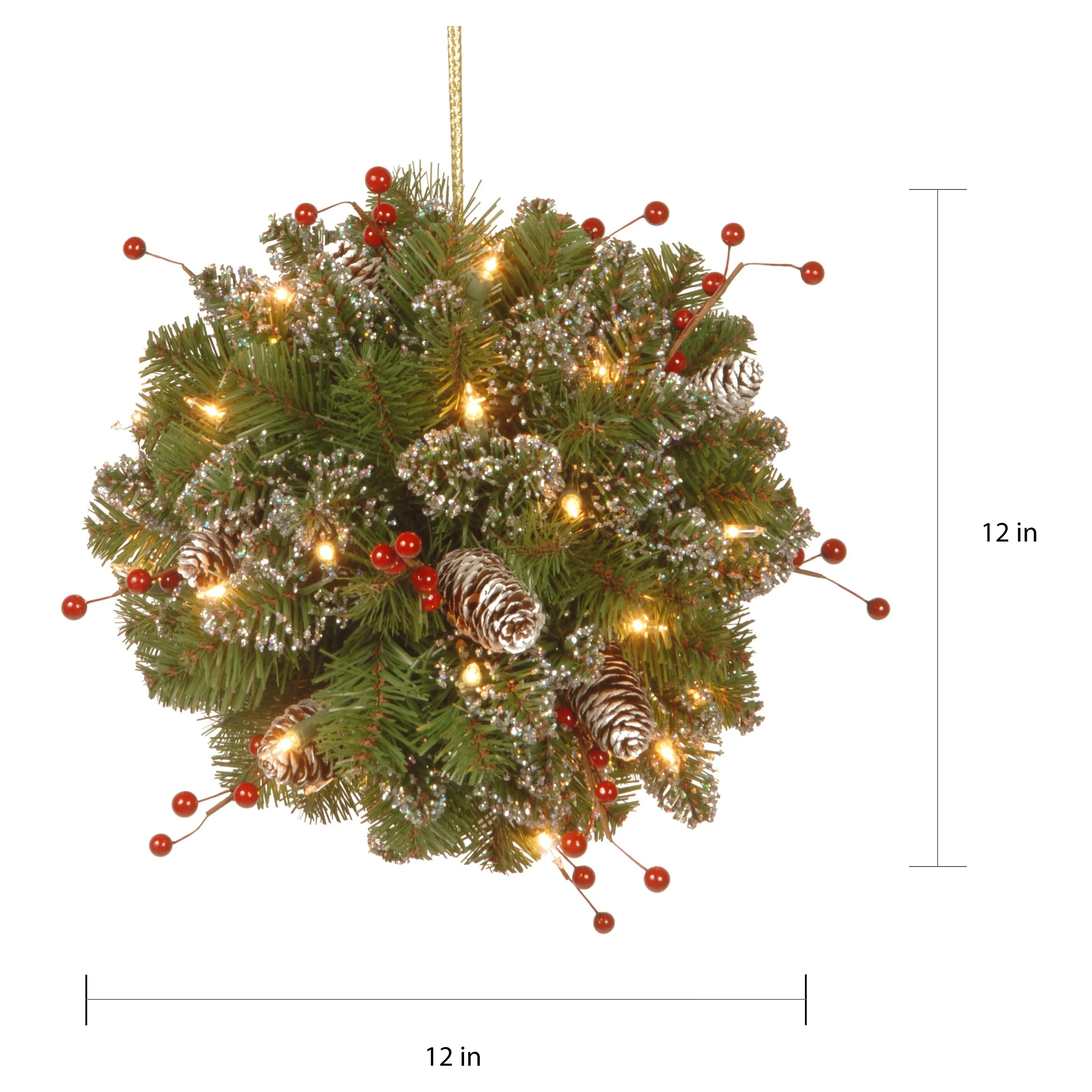 Make the holidays all the more cheery with the addition of this sparkling kissing ball. Faux spruce glimmers with frosted tips paired with white-tipped pine cones and red berries. Warm white LEDs glow via battery operation for a charming, enchanting element you are sure to enjoy year after year.