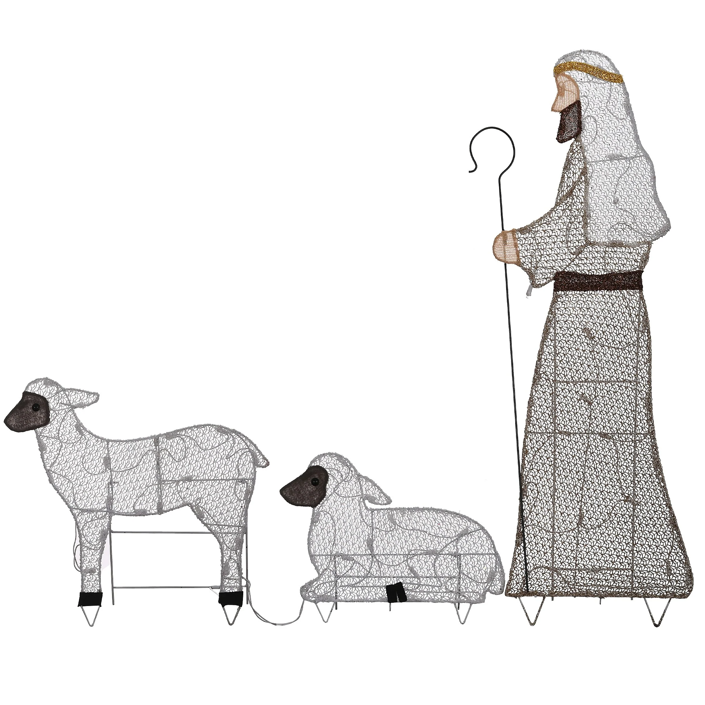 This assortment includes the figures of a shepherd with staff and two sheep, one standing and on lying down. It features metal frame construction wrapped in fabric material that is strong and durable to provide many years of enjoyment. Set is pre-lit with a total of 70 cool and warm white LED lights that make this decoration sparkle and shine. This holiday trimming can be displayed in indoor or outdoor locations.