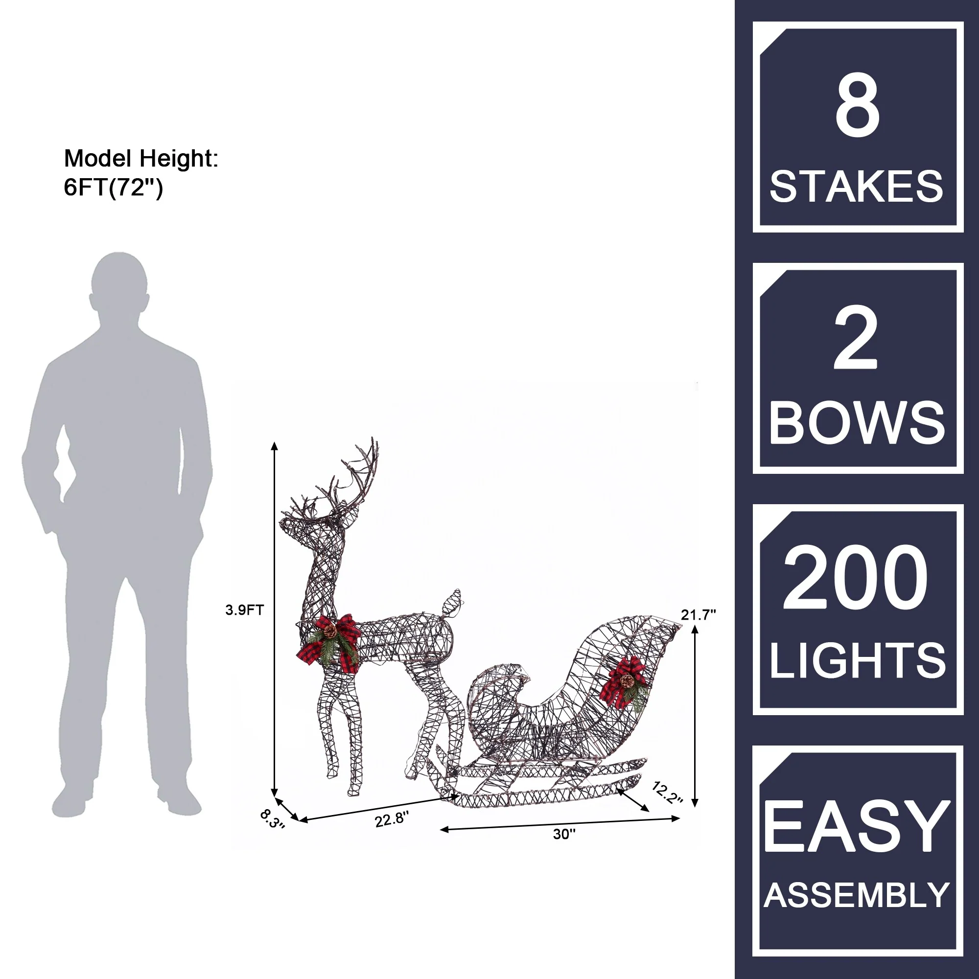 - Reindeer size: 46.8" H x 22.8" W x 8.3" D