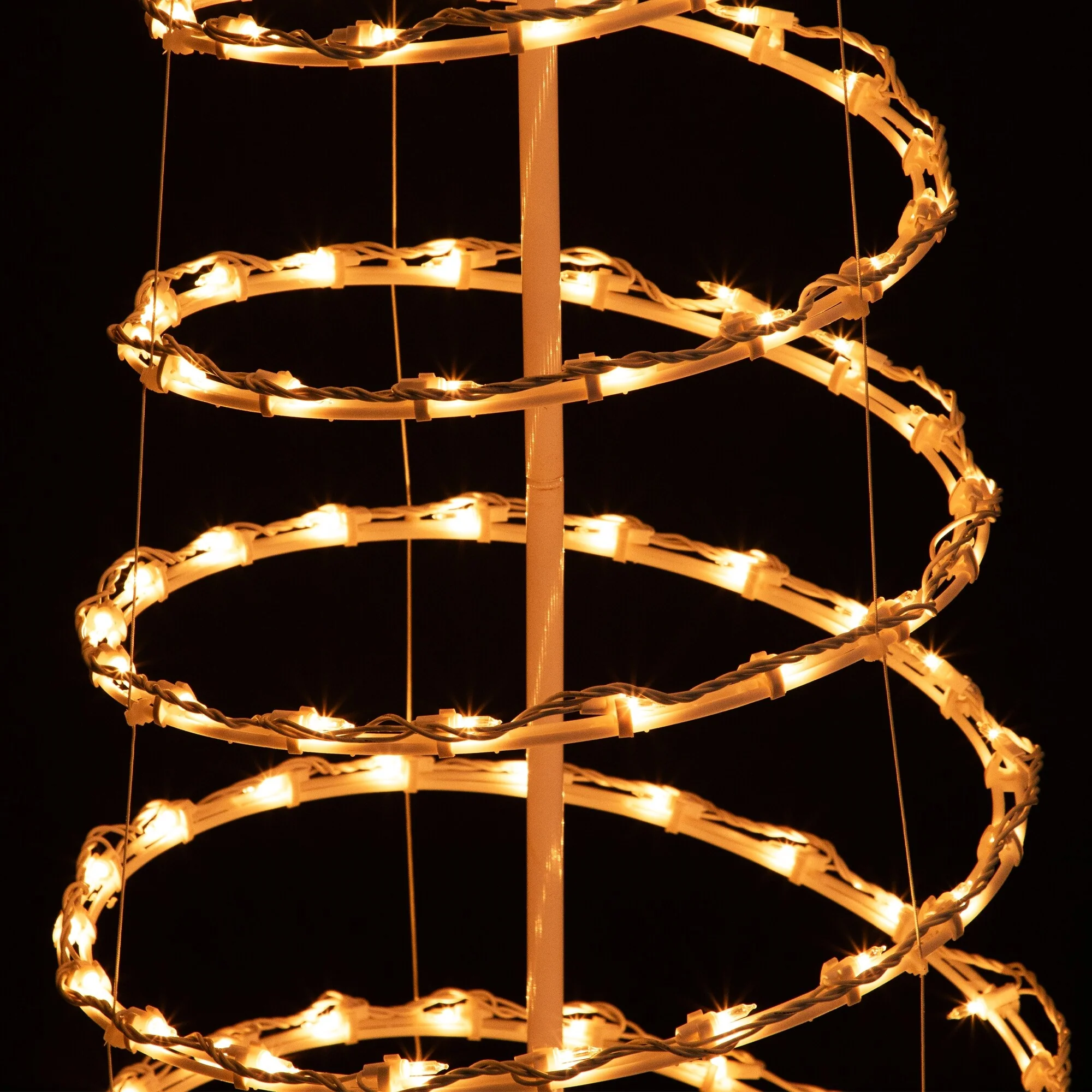 This beautiful spiral cone tree is the perfect addition to your holiday yard decor. Create your own wonderland by effortlessly adding a soft, warm glow in a unique and modern way. The tree contains an abundance of clear incandescent mini lights, that are UL listed for both indoor and outdoor use. Perfect for any area of your home or yard that needs a special holiday touch. The easy assembly allows for a quick and effortless setup, and the included lawn stakes allow you to secure the tree into the ground.