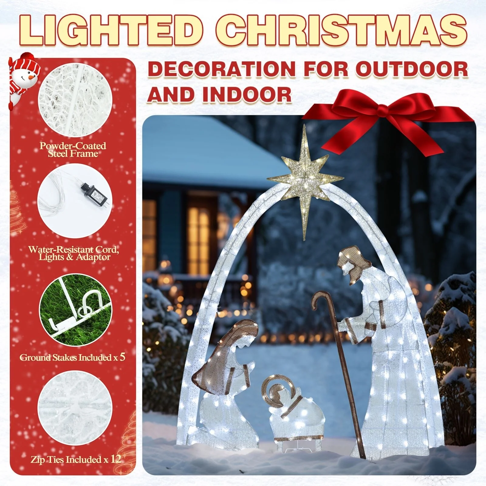 - 【Stakes and Zip Ties】Robust metal stakes and zip ties can make the Christmas holy family yard decoration fully fasten and secure on the ground. The nativity scene has been sturdy, even with strong wind blowing.