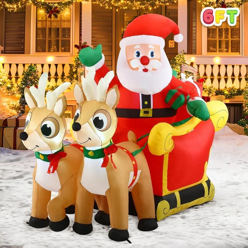 Joyfy 6ft Long Inflatable Santa on Sleigh with 2 Reindeer, LED-lit for Outdoor Christmas Décor