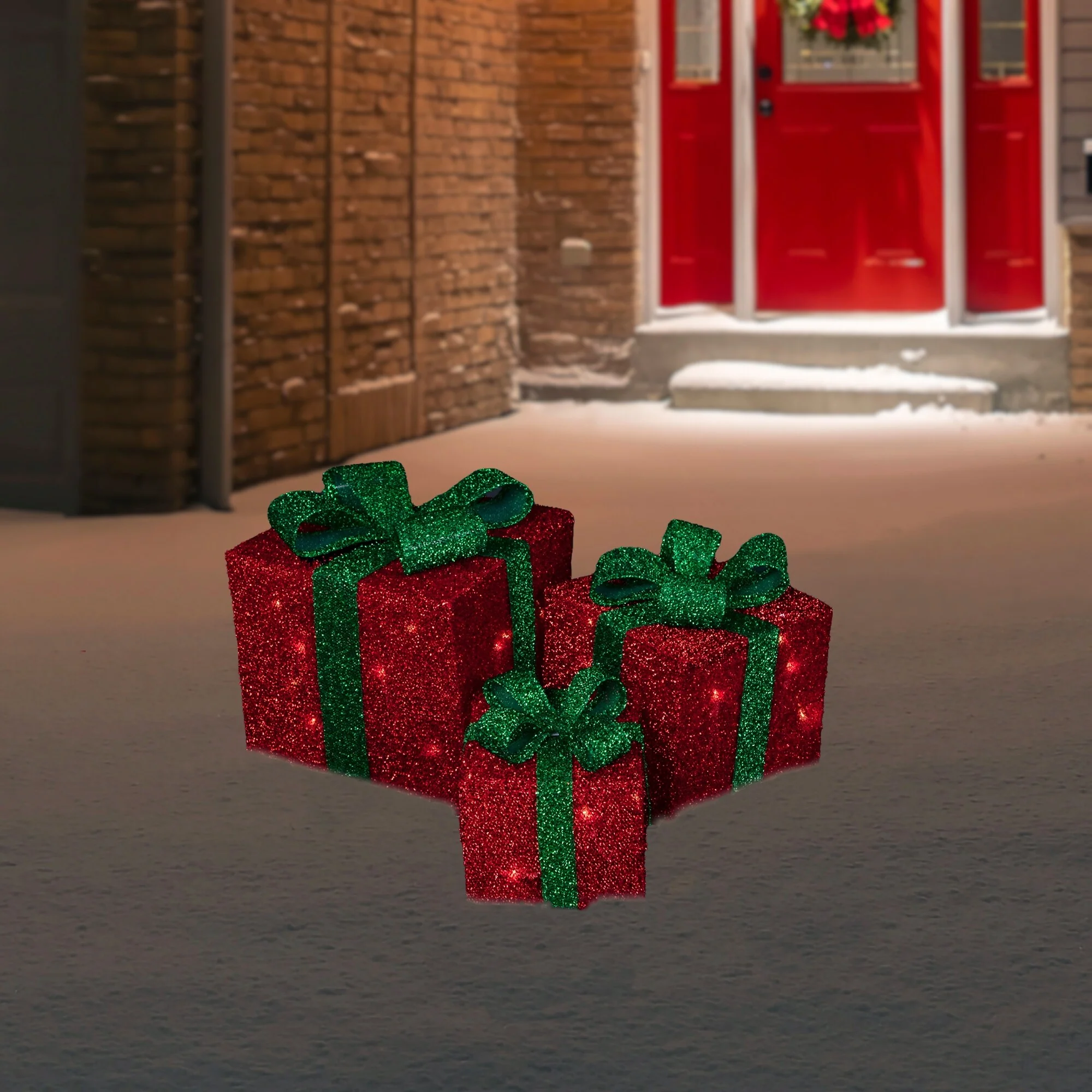 Set of 3 Lighted Sparkling Green Sisal Gift Boxes Christmas Outdoor Decorations. - 11.75"