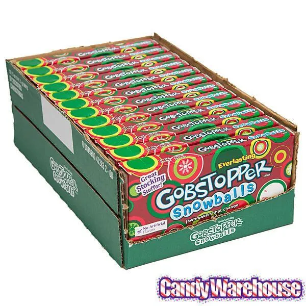 Delicious Gobstopper Snowballs jawbreakers in festive colors of red, white, and green and featuring layer upon layer of various flavors and colors!Box contains 12 Christmas Everlasting Gobstopper Candy Packs, each with a net weight of 5 ounces.Shipping Weight ~ 4 lbs.