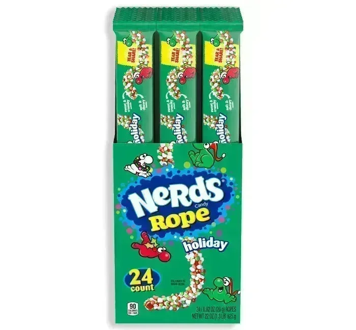 Pull it! Twist it! Bend it! Bite it! Chew it! Delicious soft gummy rope covered with tiny tangy crunchy Nerds candy in holiday colors of red, white, and green. The perfect stocking stuffer...each rope is wrapped in shiny metallic foil.