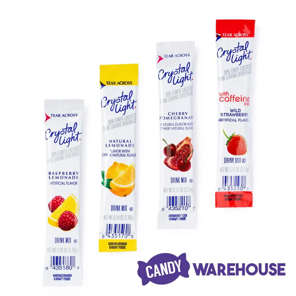 Keep your taste buds on their toes by making hydration fun with a Crystal Light drink mix variety pack. This 44-piece tub is filled with portable, convenient on the go packets that turn your 17-ounce water bottle into a refreshing fruity beverage. You get 11 packets each of four of the most popular Crystal Light flavors: cherry pomegranate, wild strawberry, raspberry lemonade, and natural lemonade. Crystal Light caffeine lovers find 60 milligrams of energy-boosting caffeine in every packet of the wild strawberry flavor. Best of all, each powdered drink mix in this 44-count variety pack is sugar-free and contains only 10 calories per packet, giving you a tasty sweet treat that doesn’t break your diet. Count on Candy Warehouse to stock all of your favorite low- and no-calorie Crystal Light products at a price you can drink to.