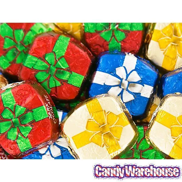 A delicious assortment of decadent chocolate squares featuring festive Christmas gift wrappers!