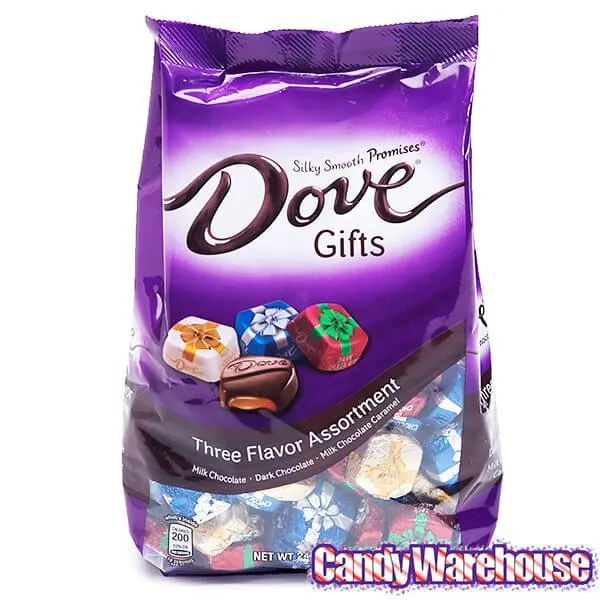 Bag contains 24 ounces of Dove Promises Assorted Chocolate Squares in Holiday Gift Foils... that's about 85 pieces.
