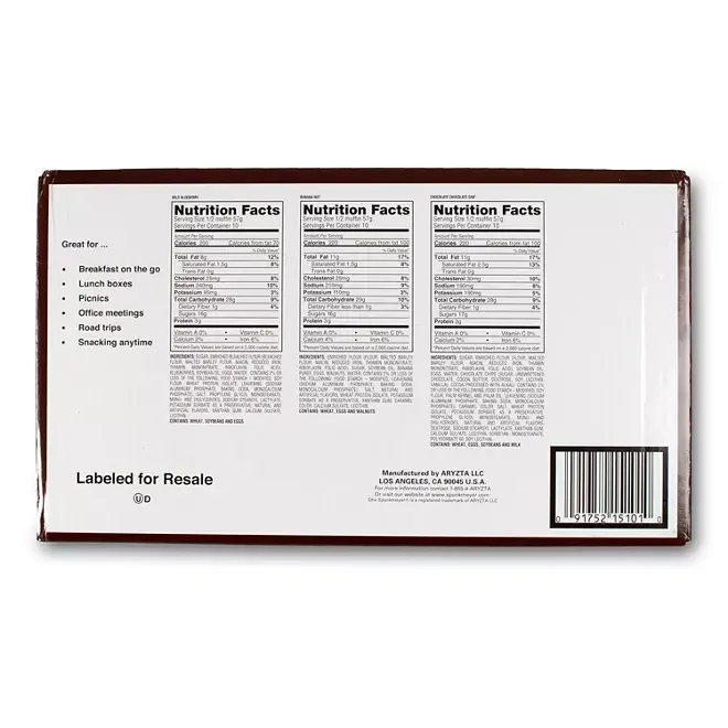 Enjoy a delicious assortment of Otis Spunkmeyer® Muffins in this convenient 15-pack variety box. Featuring Wild Blueberry, Banana Nut, and Chocolate Chocolate Chip flavors (5 of each), these moist and flavorful 4 oz muffins are perfect for breakfast, snacking, or grab-and-go sales. Individually wrapped and labeled for resale, they’re ideal for vending, convenience stores, concessions, or foodservice.