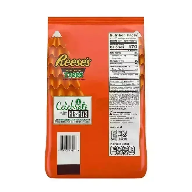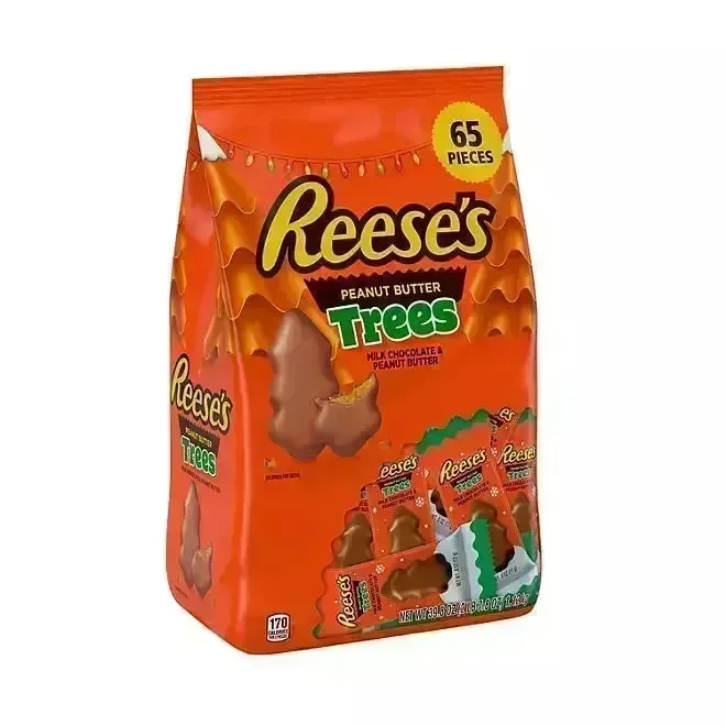 Get ready for holiday cheer with a 2 pound bulk bag of REESE'S Milk Chocolate Peanut Butter Trees! Inside, you'll find 65 individually wrapped, kosher-certified peanut butter and milk chocolate trees, each tucked in festive holiday packaging. Perfect for filling candy dishes, adding to gift baskets, or stashing in lunch boxes for a midday pick-me-up, these treats bring joy to every occasion. Celebrate Thanksgiving, New Year's, birthdays, or cozy date nights with the rich taste of REESE'S. Use them as Christmas stocking stuffers, holiday baking supplies, or a sweet centerpiece to make your home extra festive!